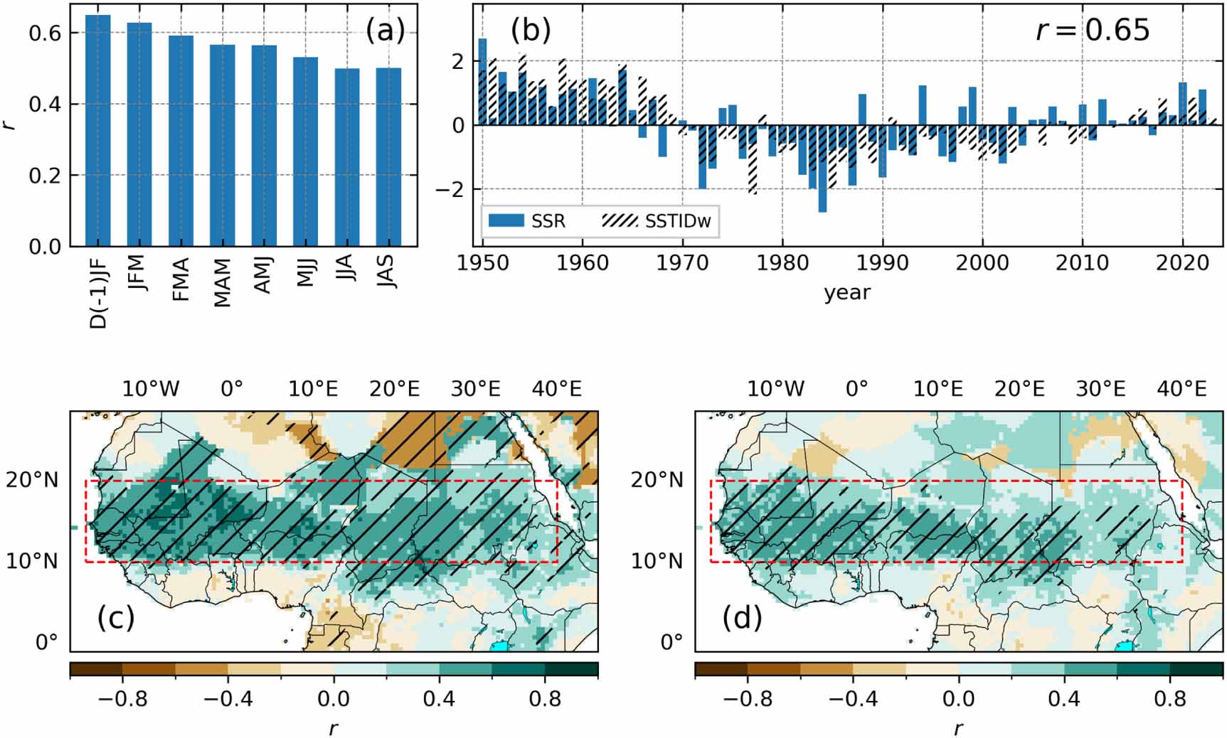 图1. (a) 季节的SSTID指数与SSR指数之间的超期与同期相关系数。(b) SSR指数(蓝色柱)和前期冬季SSTID(黑色柱)的标准化时间序列。(c) 前期冬季SSTID指数与JAS萨赫勒地区降水的相关图;阴影表示超过95%置信水平的显著性区域。(d) 如(c)所述,但对夏季的SSTID。(c和d)中的红色虚线框表示用于SSR计算的萨赫勒地区。这里的时期为1950年至2023年。