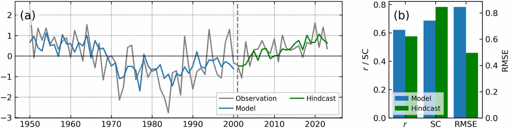 图3. (a) SSR指数时间序列(灰色线)、建模阶段模型结果(蓝色线,1950-2001年)及独立后报结果(绿色线,2002-2023年)。(b) 建模阶段模型(蓝色柱)与后报(绿色柱)的性能评估指标对比,包括相关系数(r)、均方根误差(RMSE)及符号一致率(SC)。