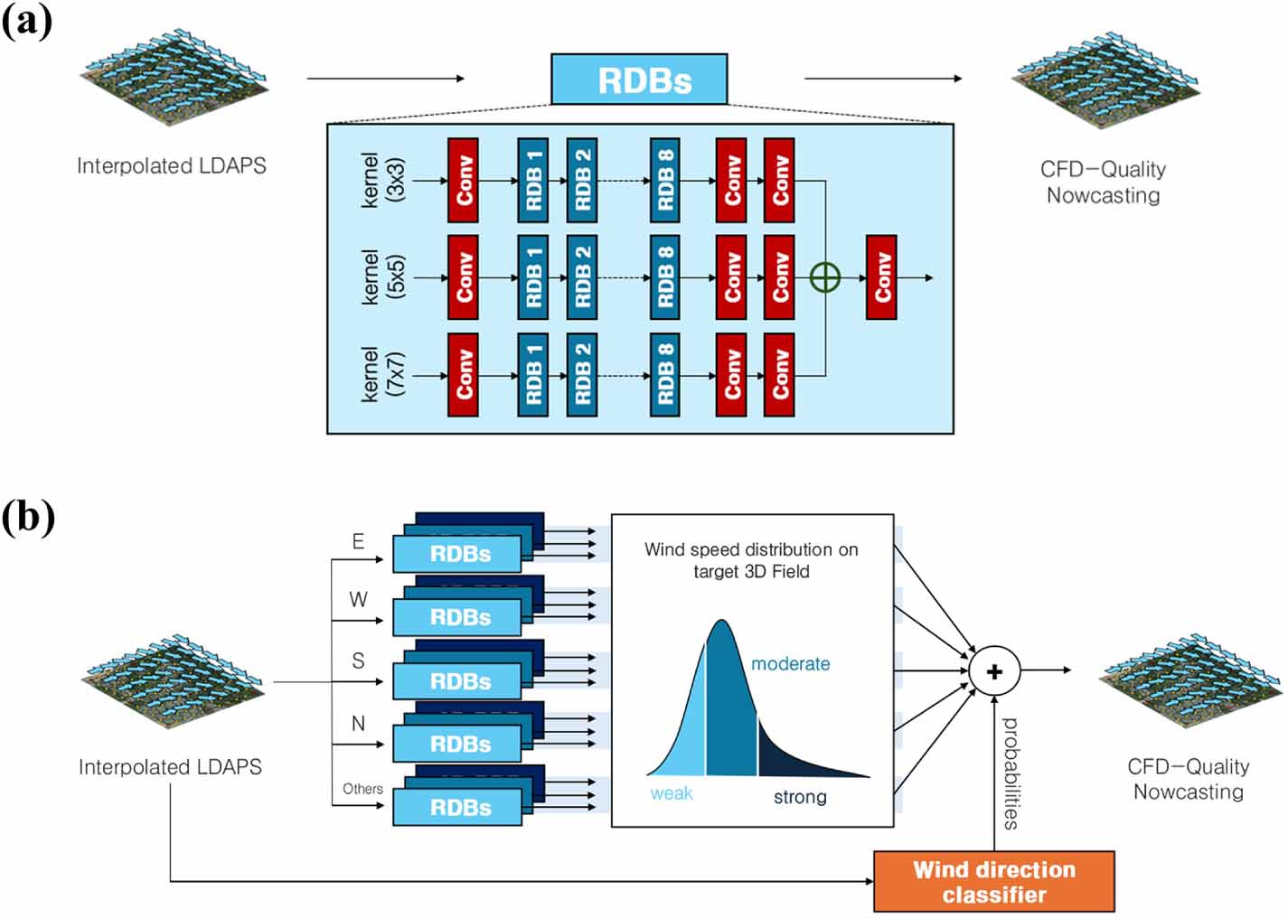 研究团队构建基于残差密集块(RDB)的深度学习架构,融合多尺度卷积核(3×3、5×5、7×7)和风向分类系统,输入韩国气象局LDAPS系统的低分辨率气象数据(1.5公里)及地表特征(地形、建筑密度等),通过15个针对不同风向/风速类别的子模块加权融合,快速生成类CFD结果。测试显示,模拟器在UAM飞行路径上风速预测均方根误差(RMSE)低于0.92 m/s(R²>0.93),温度预测RMSE低于0.59°C(R²>0.99),单GPU推理速度达6秒/小时预报,较CPU-CFD加速600~900倍。