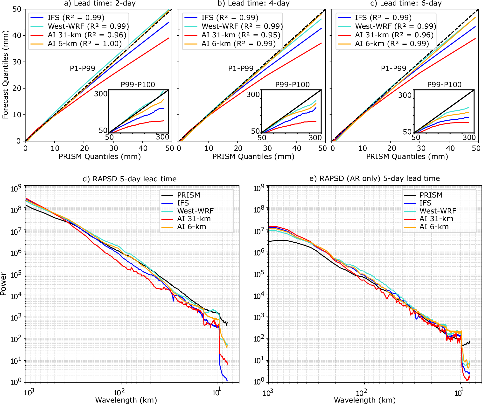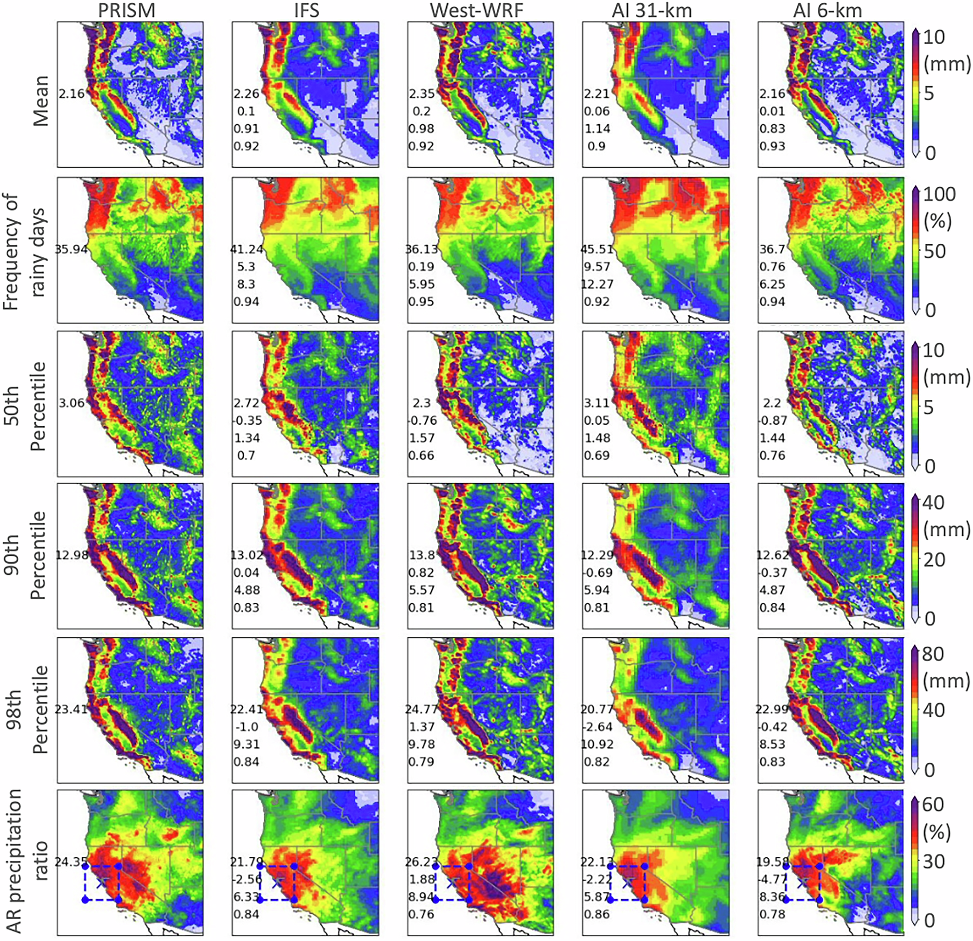 2、高分辨率模型提供更精细的空间细节:AI 6公里模型和West-WRF在捕捉高影响降水事件(特别是98百分位)和雨天频率方面与观测数据(PRISM)表现出更好的一致性,而全球模型(IFS和AI 31公里)倾向于低估高降水区域的日降水总量和湿日分布的上百分位。