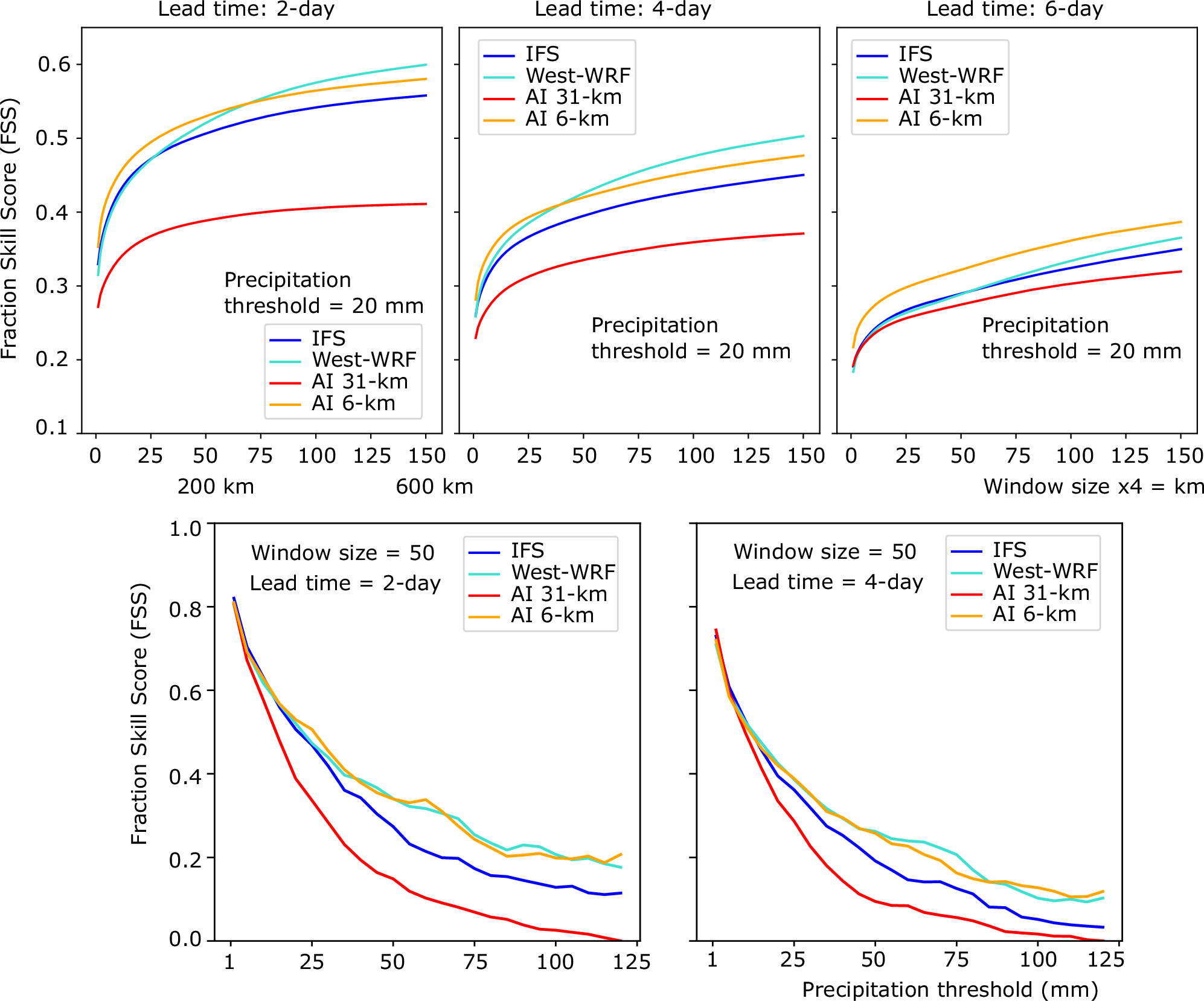 图3:动态(IFS和West-WRF)和AI模型在2天、4天和6天预报前期的分数技能得分(FSS)