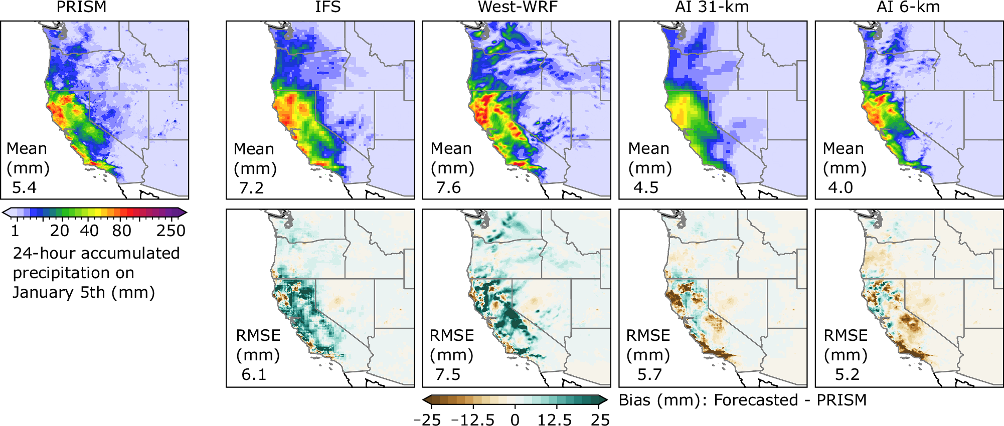 5、模型对大气河流事件具有良好预测能力:通过2023年1月5日大气河流事件的案例研究,AI 6公里模型能够准确再现降水空间分布,包括旧金山湾区和内华达山脉的降水最大值,而AI 31公里模型在极端降水区域显著低估。