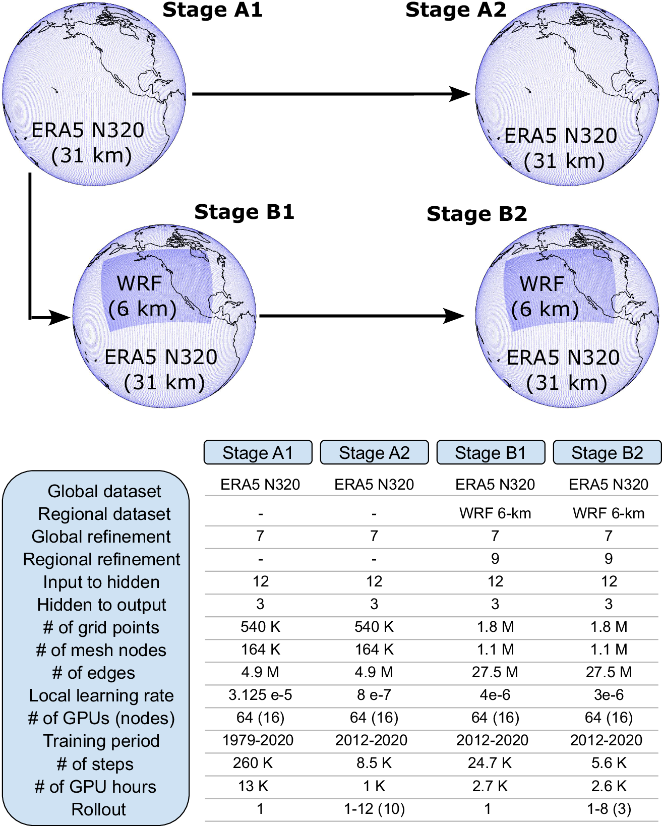 图6:用于训练全局和拉伸网格AI驱动天气模型的示意图