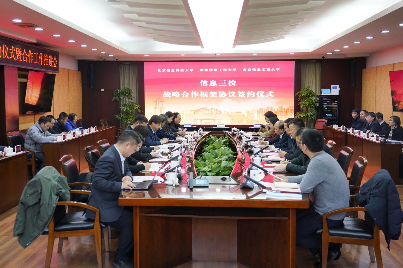【本网讯】1月19日,北京信息科技大学、成都信息工程大学、南京信息工程大学“信息三校”战略合作框架协议签约仪式暨合作工作推进会在我校航空港校区举行。北京信息科技大学校长郭福、副校长张健,南京信息工程大学校长陈海山、副校长刘佳,我校党委书记沈火明、校长何建新、副校长罗小蓉出席签约仪式。会议由我校副校长舒红平主持。