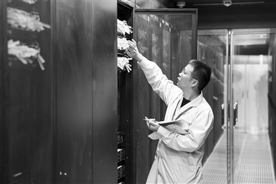 中国电信(国家)数字青海绿色大数据中心内,工作人员在机房巡检。中新社记者 薛蒂摄