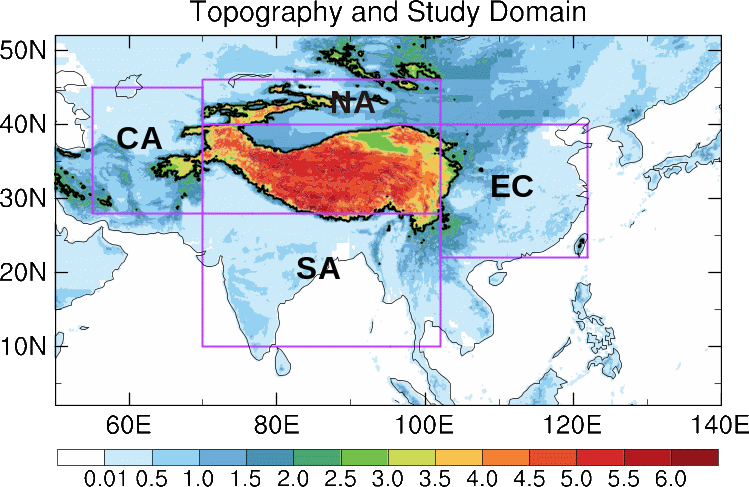图1. 青藏高原及其周边亚洲地区的地形(km)。图中四个紫色矩形框分别代表本研究中的中亚(CA:28-45°N,55-70°E)、北亚(NA:40-46°N,70-102°E)、华东(EC:22-40°N,102-122°E)和南亚(SA:10-28°N,70-102°E)。黑色实线表示海拔超过2500米的地形。