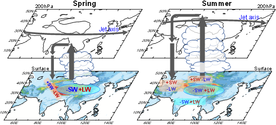 图2. 上述示意图展示了青藏高原上空的地表加热如何影响邻近亚洲地区的云量以及春季(左)和夏季(右)的地表辐射收支。上图和下图分别代表200-hPa高度层和地表层。黑色垂直箭头表示由青藏高原地表加热驱动的气流,特别是感热驱动的空气泵。浅蓝色阴影区域表示地表云辐射冷却增强,粉色区域表示减弱。白色云层反映强烈的短波冷却,而浅灰色云层反映中等程度的辐射冷却。急流轴线标示200-hPa西风急流。“SW”和“LW”分别指地表净向下短波辐射和长波辐射。下图中的加号(+)或减号(−)表示增加或减少。 |